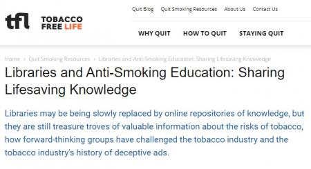 "Puede que las bibliotecas estén siendo lentamente sustituidas por repositorios de conocimiento en línea, pero siguen siendo tesoros de información valiosa sobre los riesgos del tabaco, cómo los grupos con visión hacia el futuro han desafiado a la industria del tabaco y la historia de los anuncios engañosos de la industria del tabaco…