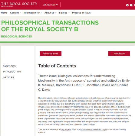 Phil Trans of the Royal Society (B), número temático sobre colecciones biológicas para entender la biodiversidad en el Antropoceno
